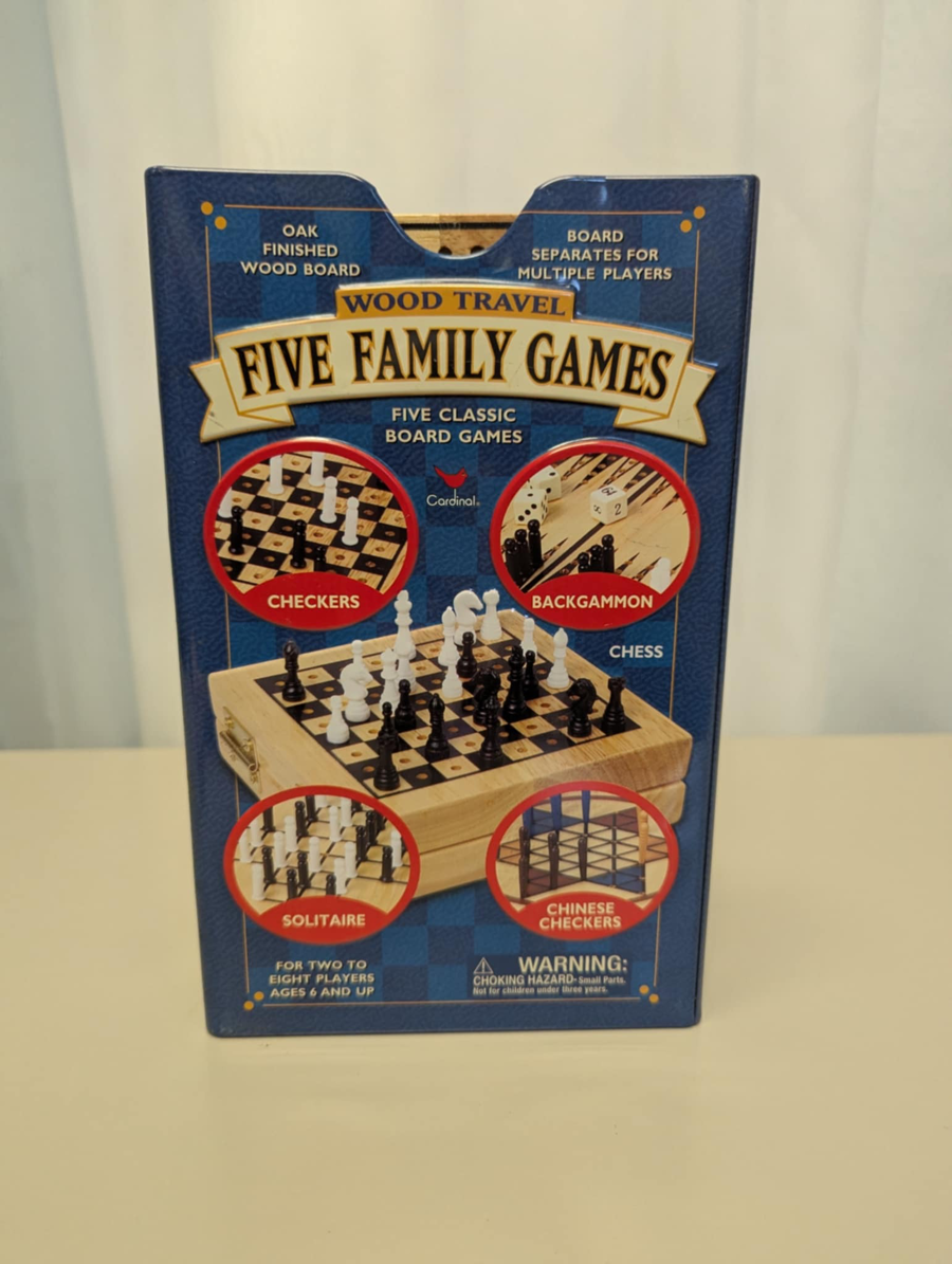 Open box/used. Contains necessary components. Oak finished wood board. Great for travel. Five classic games: Checkers, Backgammon, Solitaire, Chinese Checkers, Chess.