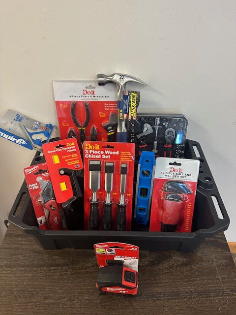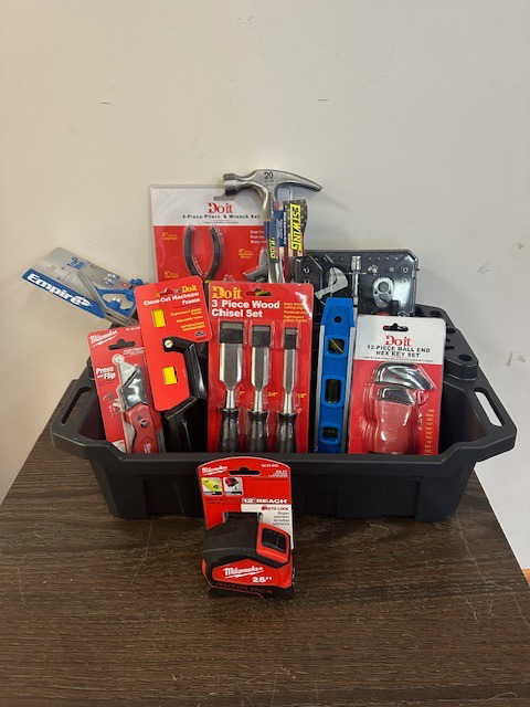 This very popular basket is perfect for the DIY lover or wanna be in your family (or for a first home/apartment)! Comes with the handy tool box and all the tools you see here: Tool Box, screwdrivers, hack saw, tape measure, hex keys, adjustable wrench, pliers, hammer, level, utility knife, drill/driver set and more!