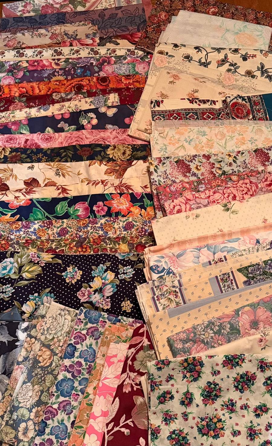 Flowers Fabric 1 (over 40 different fabrics including a 6 yard piece) Multiple pieces of fabric. No guarantees for sizes (all sizes are estimates)