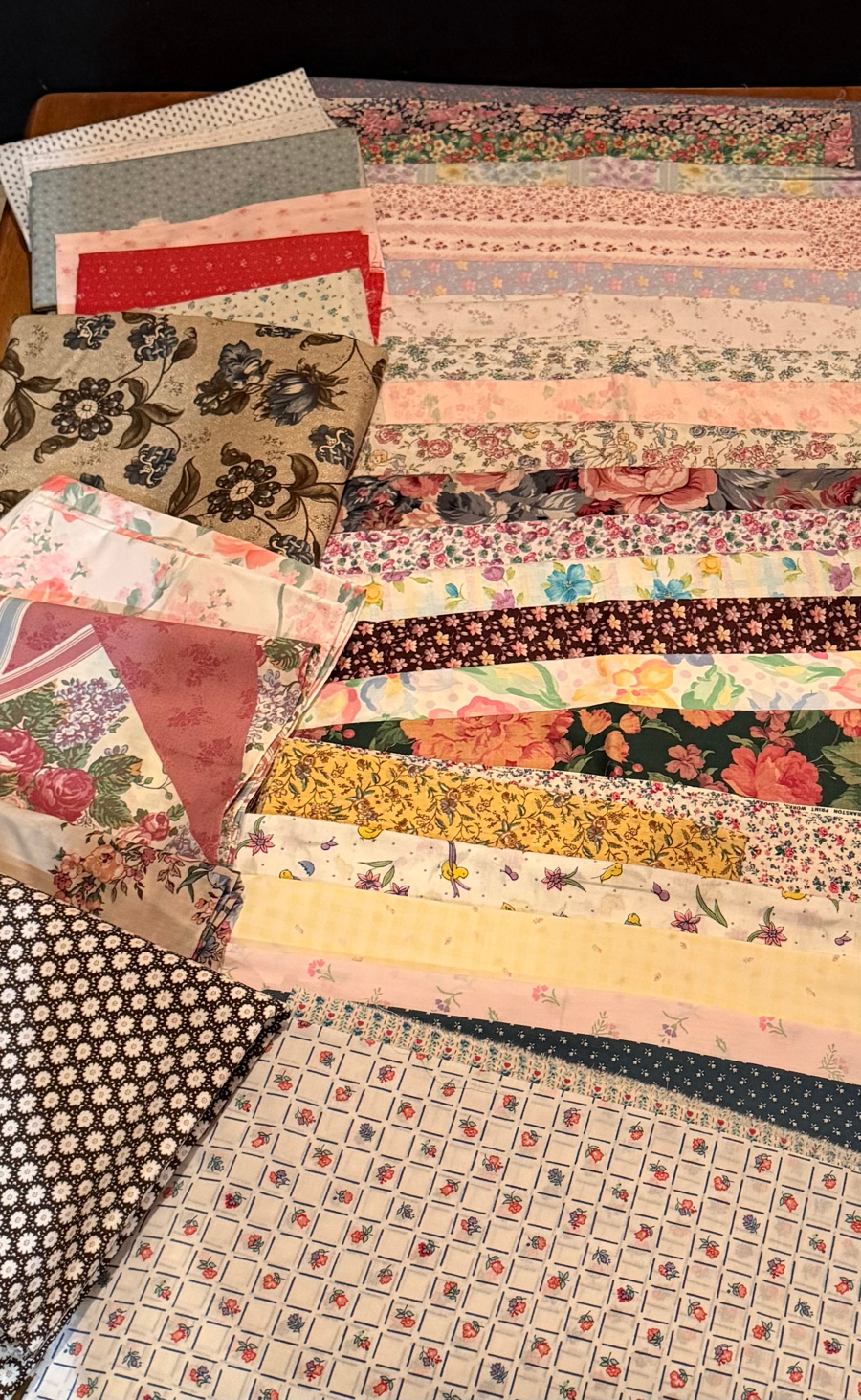Flowers Fabric 2(over 30 different fabrics including 4 yard, 2 yard and 3 yard pieces) Multiple pieces of fabric. No guarantees for sizes (all sizes are estimates)
