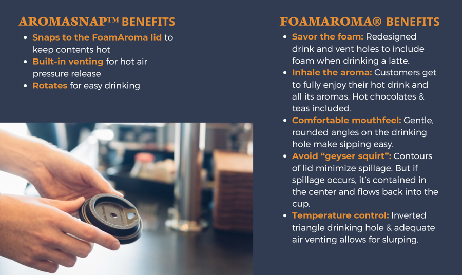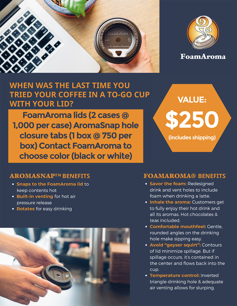 2 cases FoamAroma lids (2,000 lids) 1 box AromaSnap hole closure tabs (750 tabs) choose color (black, brown, white) Donor will ship item directly to winning bidder for free.