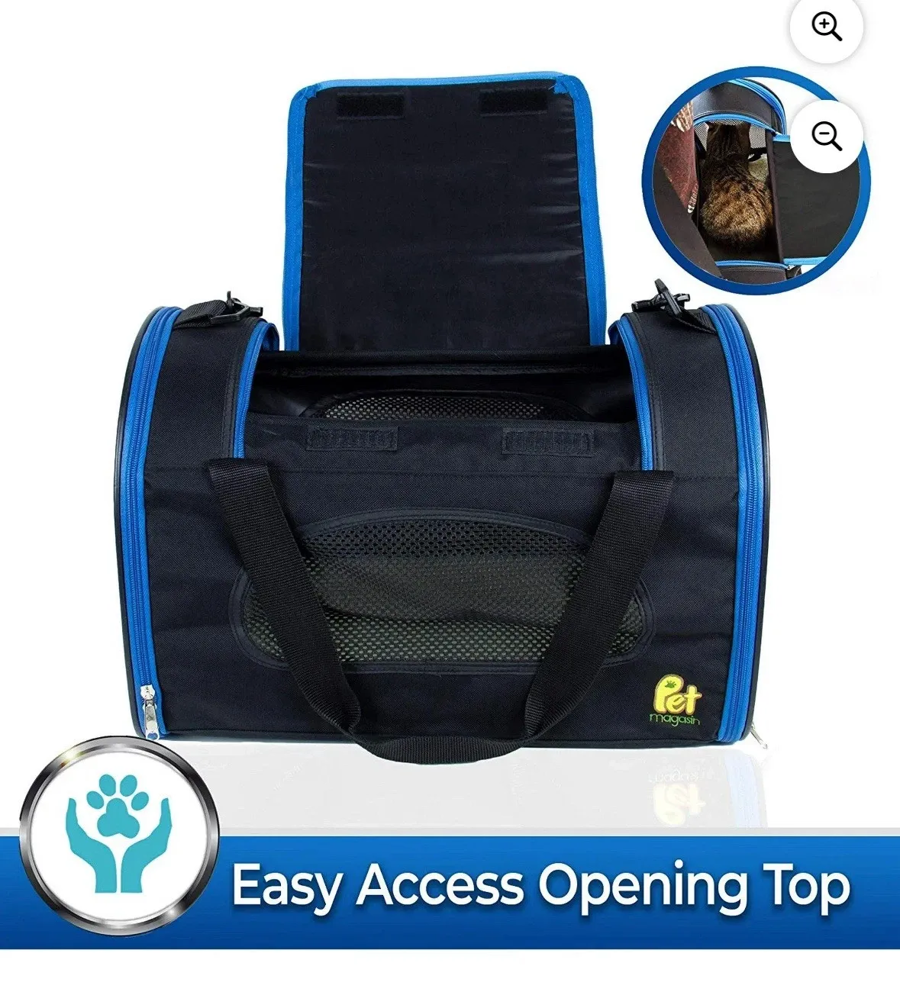 The PET MAGASIN Foldable Pet Carrier is a versatile and convenient solution for transporting small dogs. Made by Pet Magasin, this waterproof and collapsible soft pet transport bag is designed for easy travel and storage. With its compact size, this carrier is perfect for pet owners who are on the go and need a reliable way to bring their furry friends along. The durable and lightweight design makes it a practical choice for pet owners who are looking for a reliable and portable option for carrying their pets. 17" x 11.5" x 11"