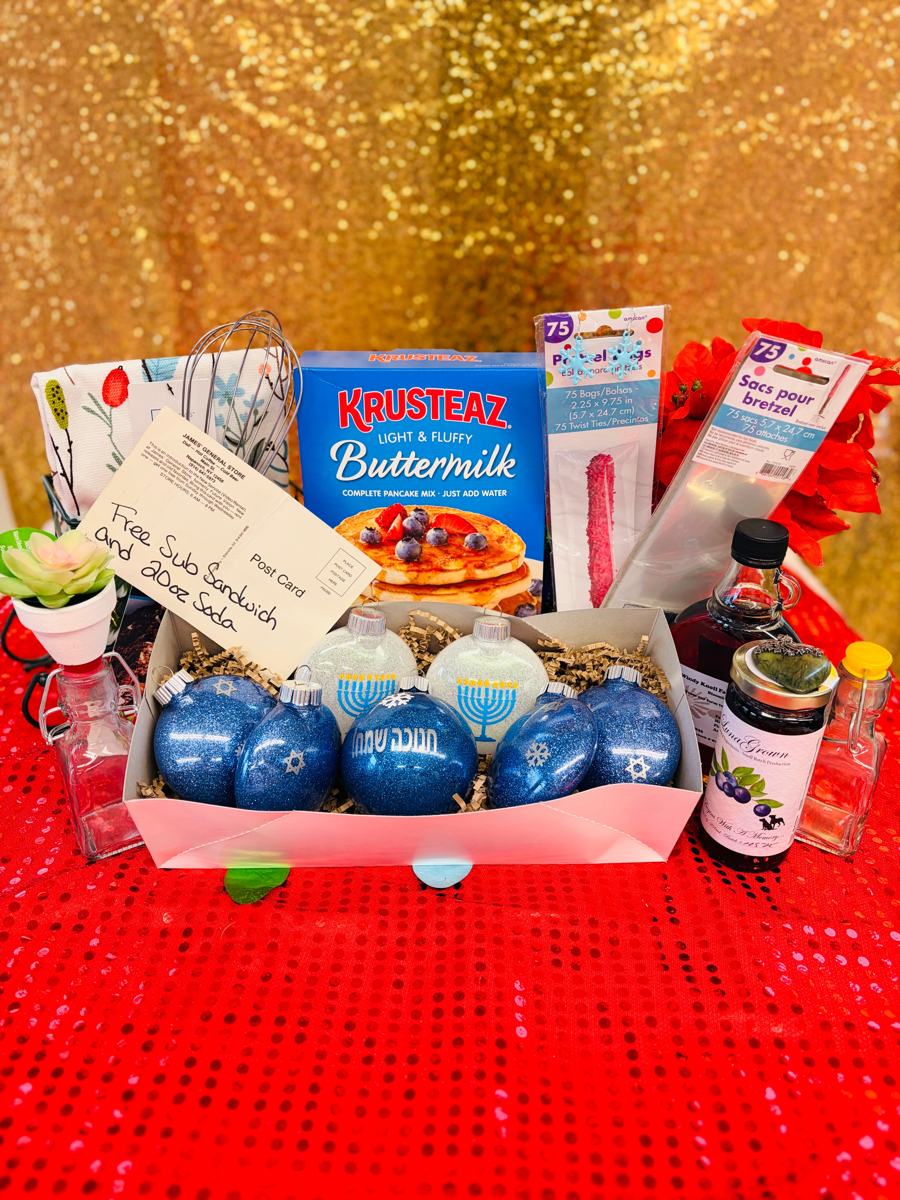 Who loves a good breakfast? This bundle has a box of pancake mix, with a whisk, a gift certificate to James' General for a Free sub sandwich and a 20oz soda, Hanukkah ornaments, syrup, goodie bags, kitchen towels, a succulent and a mini glass bottle.