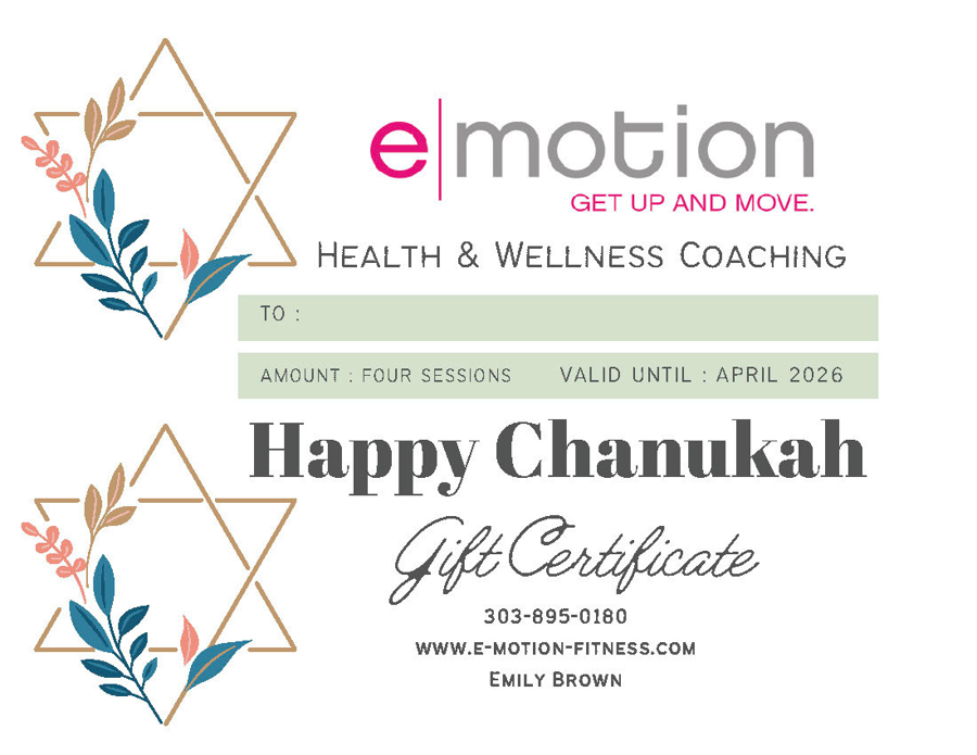Four health and wellness coaching sessions (bi-weekly) with Emily Brown NBC-HWC. In these sessions you will focus on the habits and behaviors that will produce results for your personal health and wellness goals. These topics can vary from movement/exercise, nutrition, sleep, stress, weight-loss, career, transitions in life, relationships, the list goes on and on. Valid until April 2026.