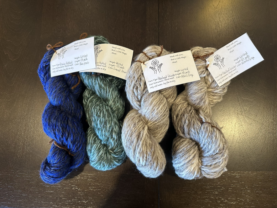 Noah is truly a craftsman when it comes to all things wool, yarn, and crocheting. He hand spins his own yarn on an antique spinning wheel. With his magic hands he has crafted 4 skeins just for you!