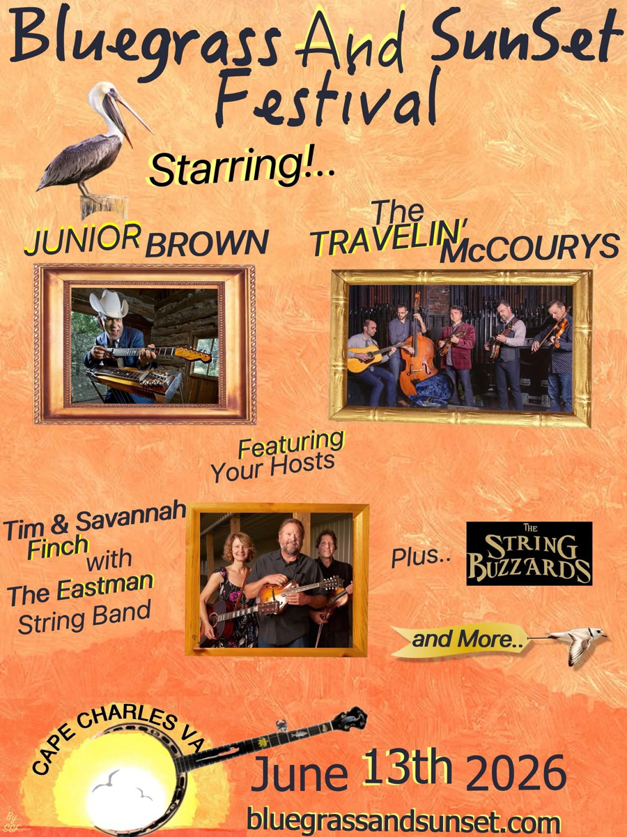 Enjoy an unforgettable day of music on the Shore with four (4) tickets to the Bluegrass and Sunset Festival in Cape Charles, Virginia on June 13, 2026. This lively festival features an outstanding lineup including Junior Brown, The Travelin’ McCourys, and more—plus great vibes, beautiful scenery, and the perfect soundtrack for a summer evening.