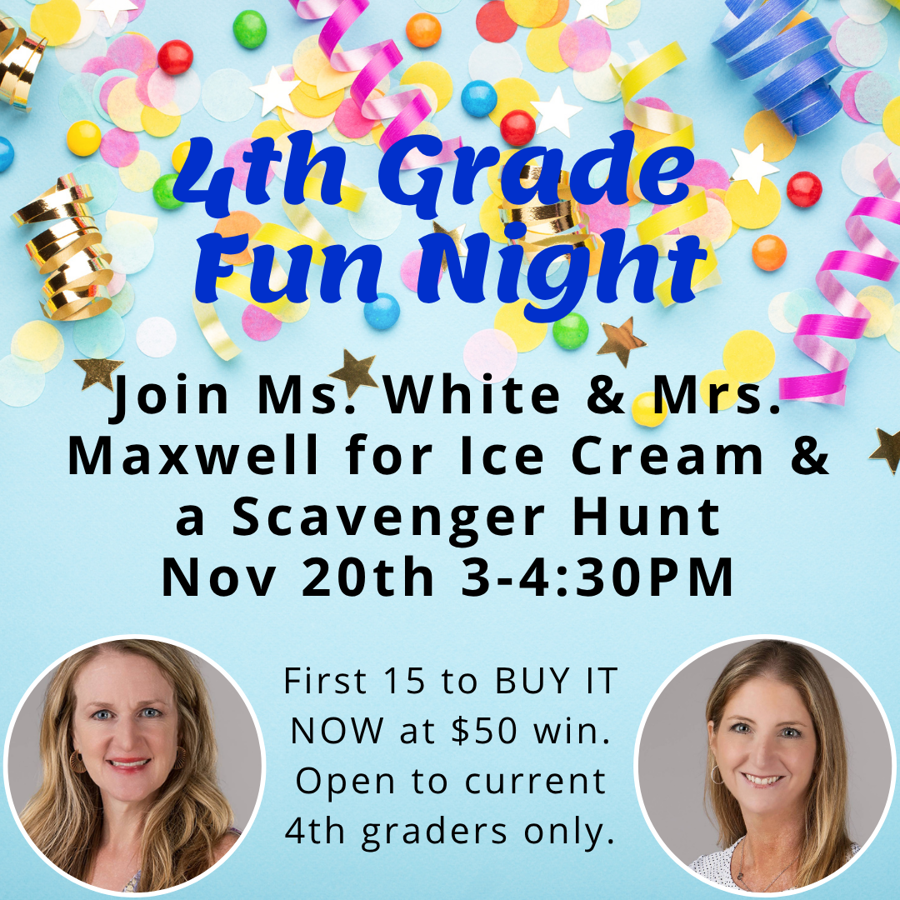 Join the 4th grade teachers for ice cream and scavenger hunt after school on Thursday, November 20th from 3-4:30pm.