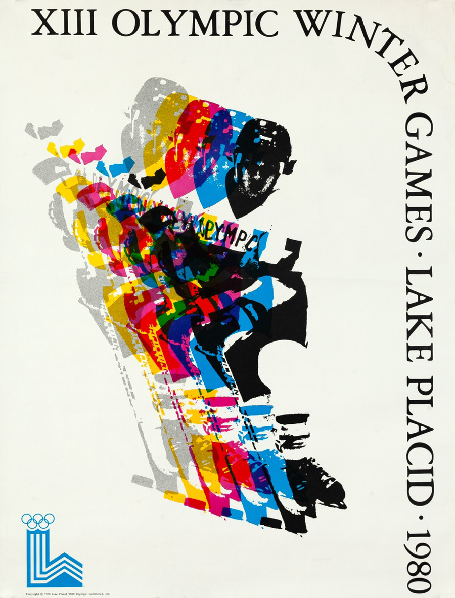 Framed print from the 1980 Winter Olympic games advertising the games and depicting 4 hatch penny overlapping hockey players. Size is 19 inches wide by 25 inches tall. Donated by Brian Kovelman.