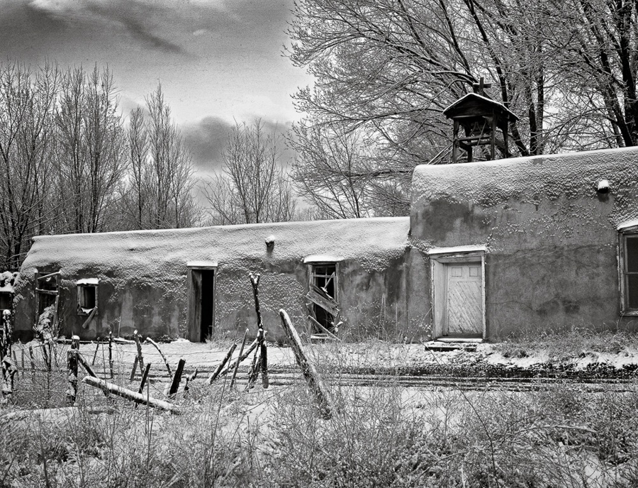 The beauty of winter is captured in a stunning framed photograph of the Plaza del Cerro, taken by renowned New Mexico photographer, Don Usner. This image showcases the Plaza del Cerro blanketed in snow.