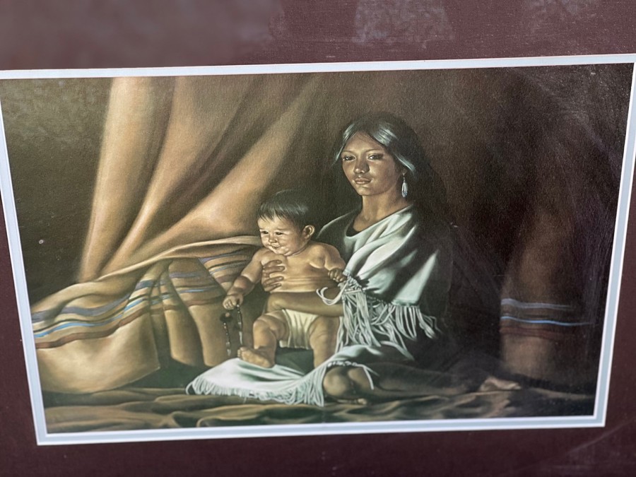 Landscape painting of Native American mother and her child. White outline and brown border with dark wooden frame. Size 25" X 20.5"