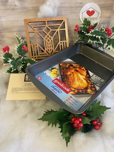 A beautiful trivet inspired by a window from Frank Lloyd Wright's architecture at Lake Geneva Inn and a roasting pan
