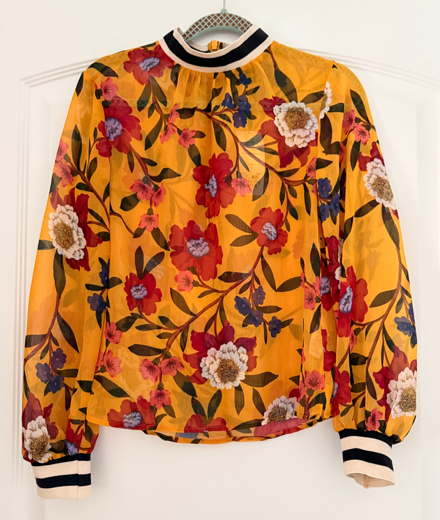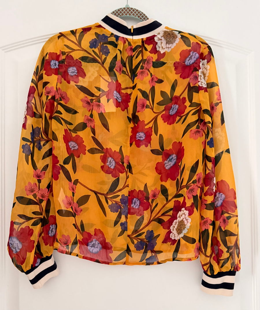 Add some elegant style to your everyday look this year with the Eloise Crinkle Printed Top in yellow from the trusted designer brand French Connection. With a convenient zip back fastening, long sleeves and a stretch-knit collar and cuffs, this comfortable top is sure to become an essential part of your wardrobe. With its striped design and the stretch-knit collar and cuffs and all-over floral print, this lightweight top will give your casual look a simple touch of style. Pair it with jeans and heels and you are good to go! Tags still on garment. Color: Mustard yellow with multicolored floral design Condition: Brand New Size: 6