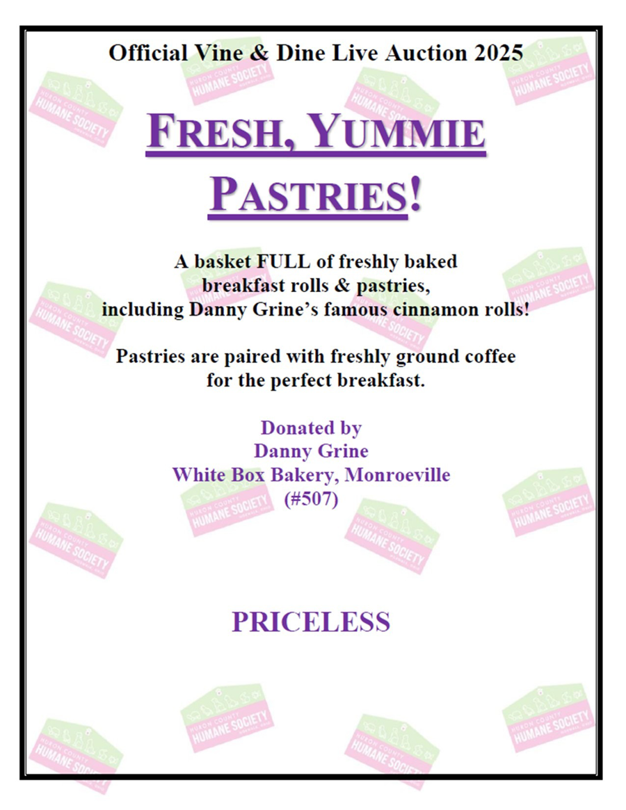 LIVE AUCTION ITEM Fresh Yummy Pastries! - A basket FULL of freshly baked breakfast rolls & pastries, including Danny Grine’s famous cinnamon rolls! Pastries are paired with freshly ground coffee for the perfect breakfast. Donated by Danny Grine, White Box Bakery, Monroeville