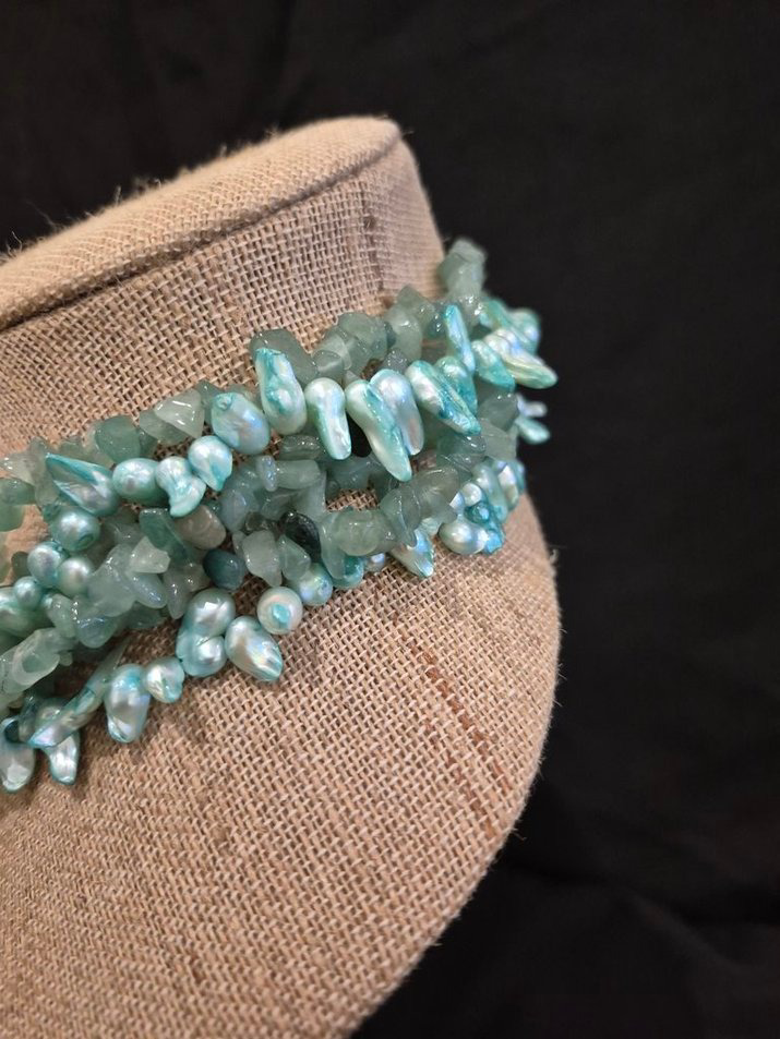 Make a bold and sophisticated statement with this stunning 6-strand freshwater pearl choker, measuring 18 inches in length. This beautifully layered piece features two complementary shades of green—one a soft, luminous hue and the other reminiscent of rich jade—creating depth, contrast, and eye-catching elegance. At the center sits a striking statement stone that cleverly houses the clasp, blending beauty with functionality. The concealed closure design makes the necklace easy to put on and remove while maintaining a seamless, polished look from every angle. Freshwater pearls are organic gemstones formed by mussels in lakes and rivers. Unlike saltwater pearls grown in oysters, freshwater pearls are composed of solid nacre, giving them exceptional durability and long-lasting strength. Perfect for formal occasions, evening wear, or elevating a classic outfit, this piece exudes sophistication and individuality.
