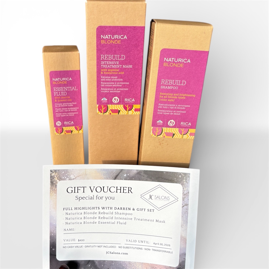 This package includes a full highlights service with Darren at JC Salons. After your appointment, continue the salon-quality care at home with a Naturica Blonde gift set of 3 premium hair treatment products designed to nourish, strengthen, and shine.