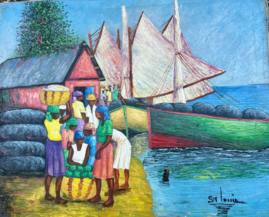On the dock, people are busily loading the boat and preparing to set sail—a moment of family union, or perhaps impending separation.