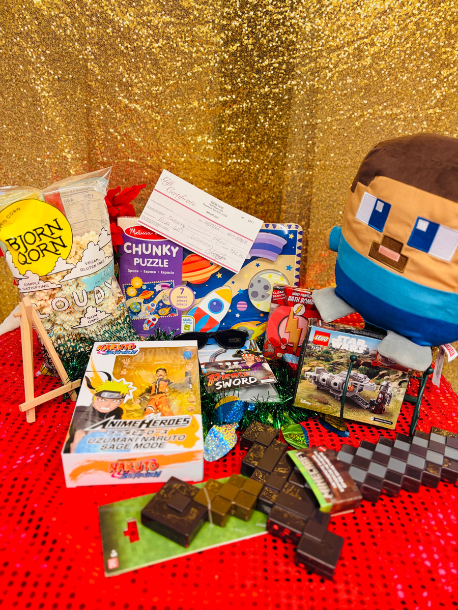 This contains a $20 gift certificate to Ricke Lens, a kids chunky puzzle, DC Flash bath bomb, a Star Wars Mandalorian Lego set, sunglasses, a bag of Bjorn Qorn, a Anime Heroes Uzumaki Naruto Sage Mode Action Figure, a pirate inflatable sword, a Minecraft sword and plushie.