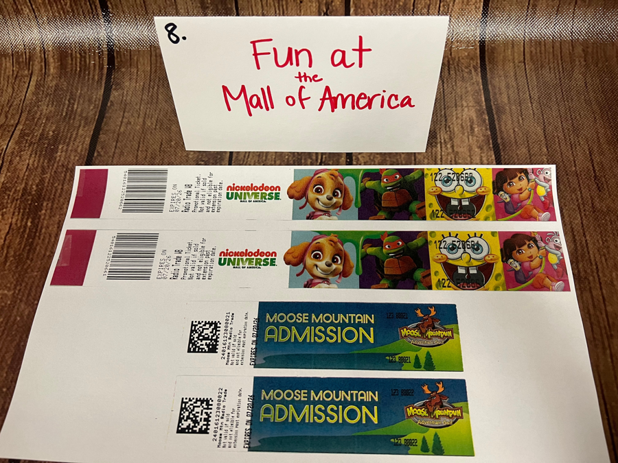 2 Unlimited Ride wristbands to Nickelodeon Universe (exp. date 7/20/26) 2 Moose Mountain (mini golf) admission tickets (exp. date 7/20/26)