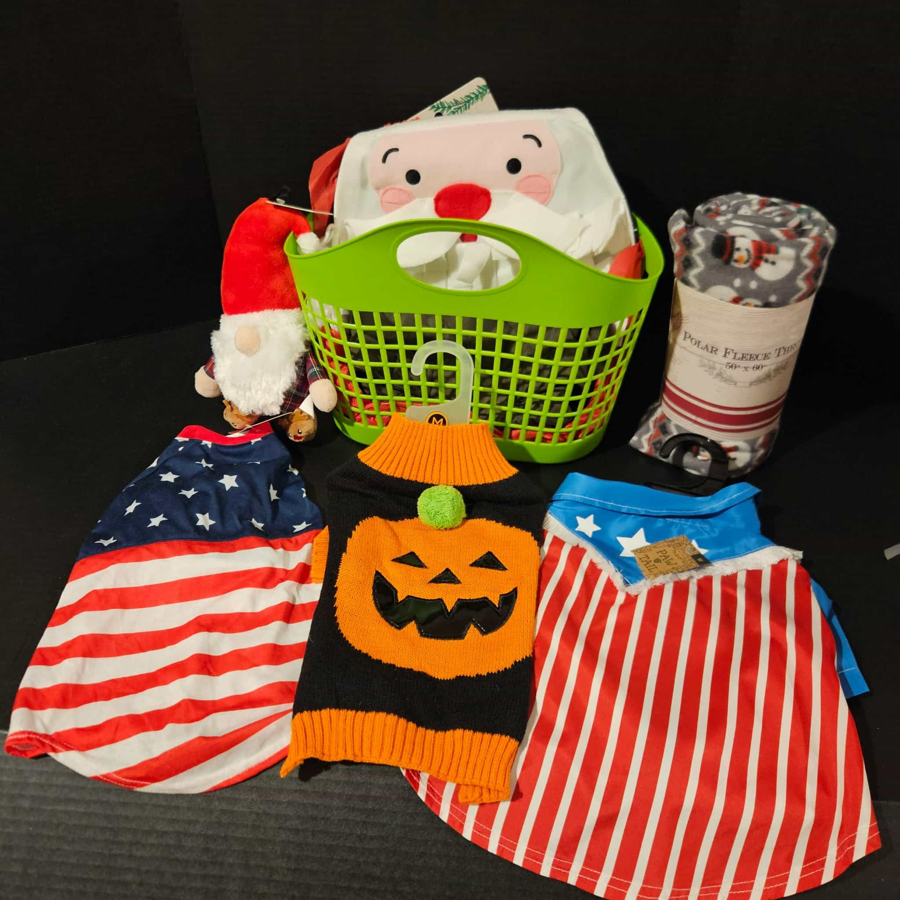 This auction item is for medium size dogs, and we have quite a variety! Look at the green festive coat, red/black checkered coat, puffy jacket, and a suede look jacket! More clothes for different seasons, patriotic tee shirt, Halloween pumpkin sweater, and another patriotic shirt, along with a Santa Snuffle mat! If your dog enjoys wearing outfits, then these items are a must! Good luck, hope you win this collection of medium sized clothes for your furry friend!