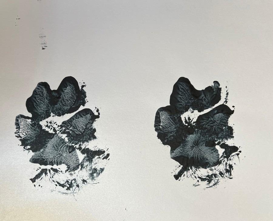 Paw prints from resident high-content wolfdog Gambit on thick paper. Once Gambit settled into his new home, he became a fairly confident boy. He still prefers not to be touched, but makes an acception for his favorite humans. Above all else, he enjoys his large enclosure and his neighbors, who he plays with at length through their shared fence line. Fun Fact: Gambit once stole an item (poop bucket) from a Caretaker so quickly that he spooked himself in the process and ran off leaving behind a spilled bucket and a human who was very shocked at his cheeky behavior.