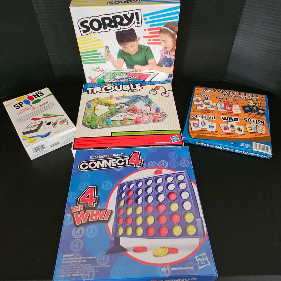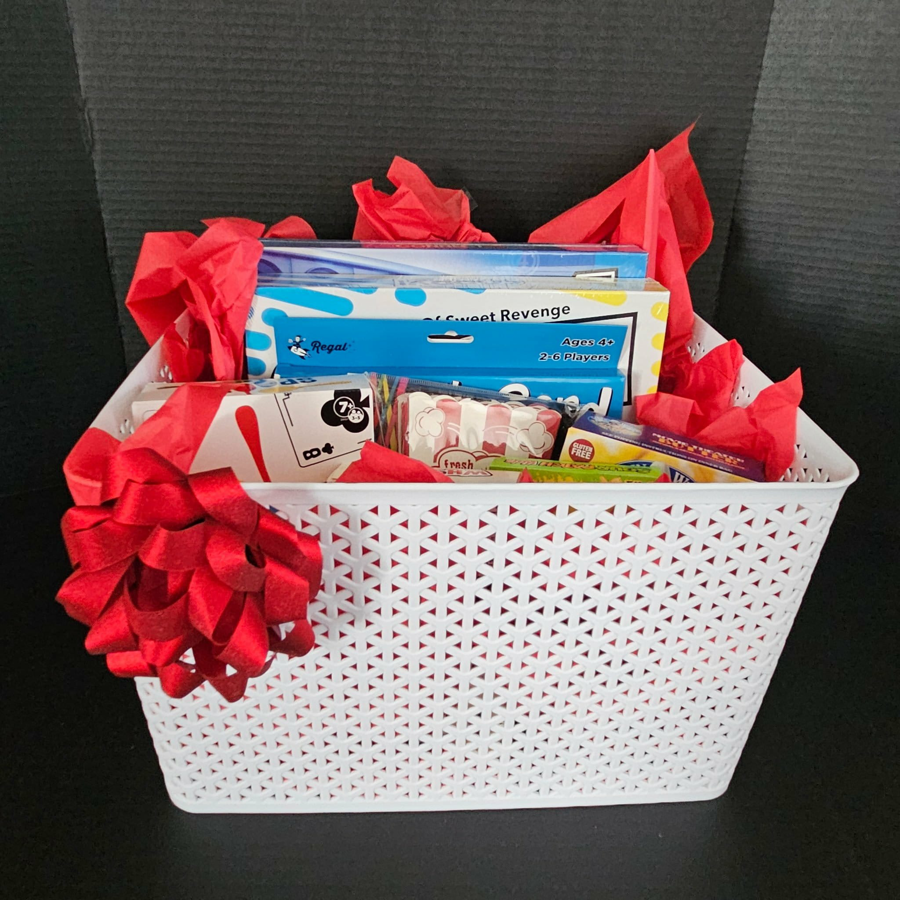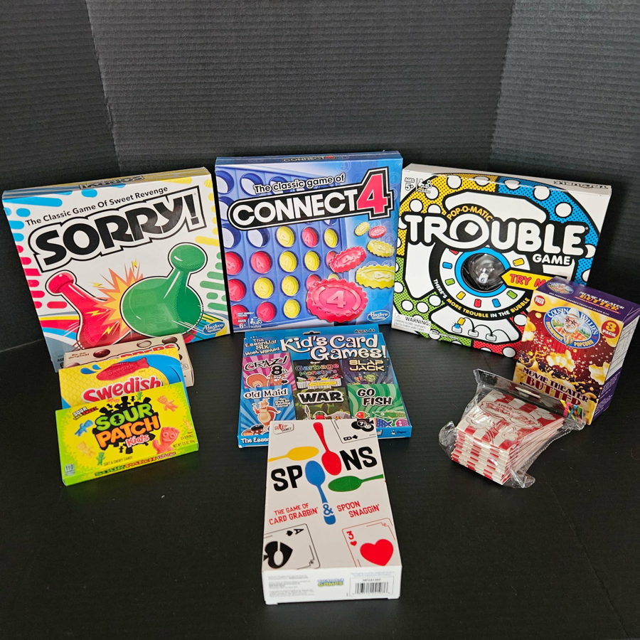 The weather outside might be frightful, but a fun night inside with family playing games will warm your hearts! A great collection of the classic games that have been around for years and years! Pop up some buttery popcorn (small bags included) and enjoy some candy treats while you play game after game! Games included are Spoons, Trouble, Sorry, Connect 4 and a collection of numerous card games. The family will have some fun times together, with these games, don't let them pass you by!