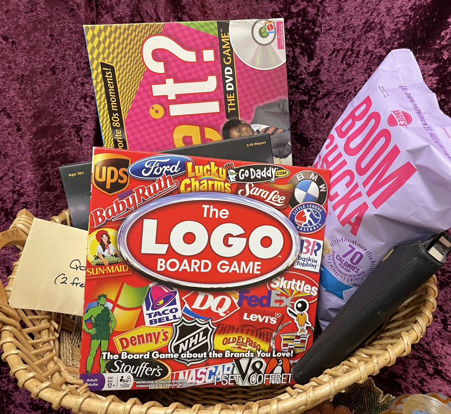 #1064 - Enjoy a night of games and nostalgia with this fun-packed gift set! It includes the LOGO board game, a trivia night game, 80’s Scene It, a set of vintage coasters, and two decks of cards. Also included are two free entrees at Qdoba and a bag of Boom Chicka Pop sweet & salty kettle corn—perfect for snacking while playing and adding a tasty twist to game night. Gently used / Not redeemable for cash.