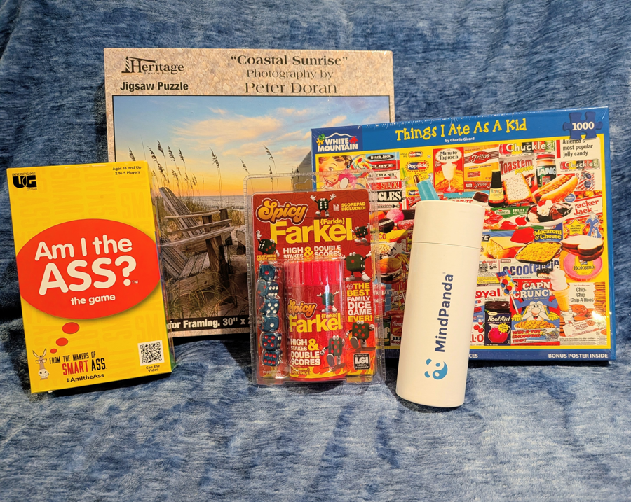 Auction Item: Puzzles, Games and Fidgets, Oh My Includes: Things I Ate as a Kid 1000 Piece Puzzle, Coastal Sunrise 1000 Piece Puzzle, Cats 500 Piece Puzzle, Am I the Ass? the game, Spicy Farkel, and Mind Panda, 3 Calming Lightly Scented Therapy Fidget Balls. Donated by: Toby Bobbitt Heidi Anderson