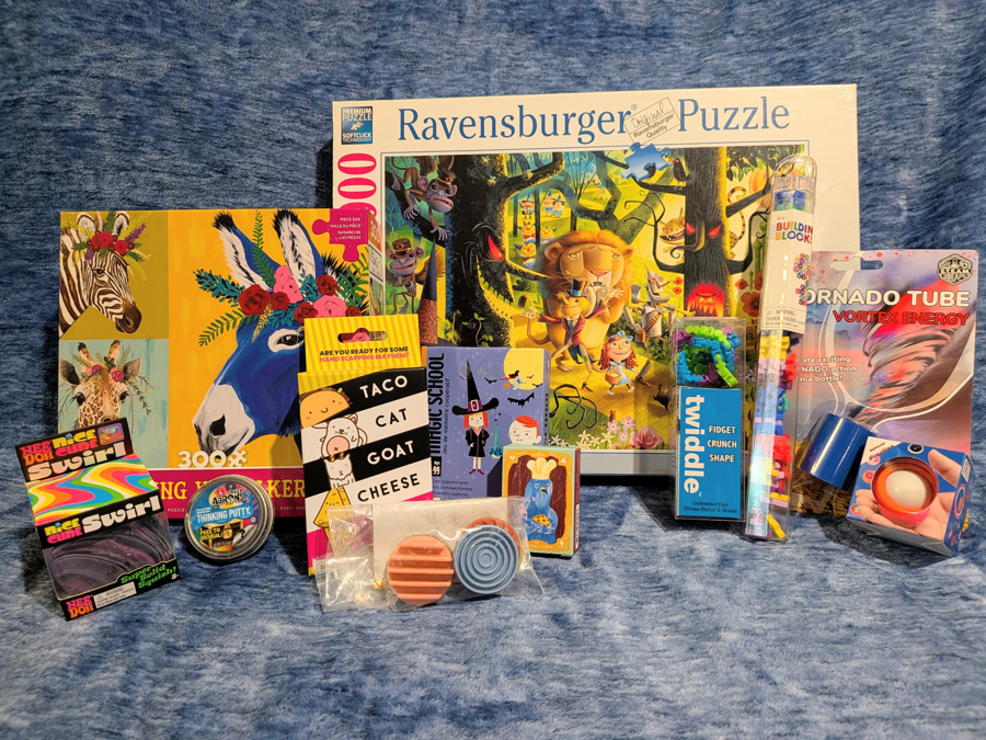 Auction Item: Games, Puzzles and Fidgets Oh My Includes: Modern Wizard of Oz Ravensburger 1000 Piece Puzzle, 300 piece floral animal puzzle, Taco, Cat, Goat, Cheese Card Game, Magic School matching Game, mini playing cards, mini building blocks, mini thinking putty, tornado tube vortex energy, gyroscope fidget, Twiddle fidget, Swirl Nice Cube Needoh fidget, and sensory coins. Donated by: Heidi Anderson
