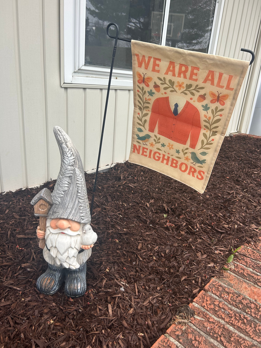 Introducing our delightful Garden Bundle, perfect for adding charm and personality to your outdoor space! This unique set features a whimsical garden gnome that will bring a smile to your face every time you see it. Accompanying the gnome is a Mr. Rogers yard flag, showcasing the beloved red sweater and spreading positivity in your garden. To complete the bundle, we've included a sturdy yard flag holder, ensuring that your flag stands tall and proud in your yard. Enhance your garden's aesthetic with this enchanting combination and make your outdoor area a welcoming haven!