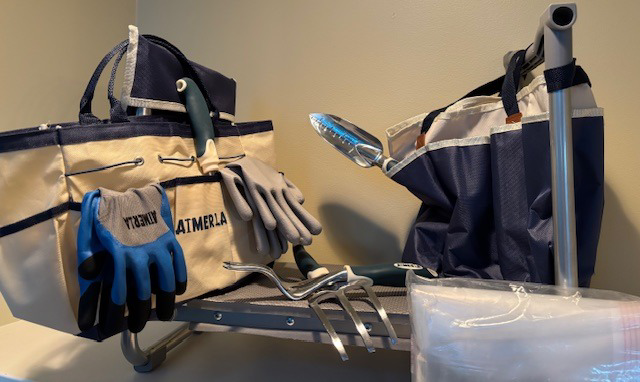 Foldable Gardener's Kneeler/Seat with 2 Large Tool Bags and Heavy Duty Tools, including - Weeding Knife , Weeder, Pruner, 2 Cultivators, Hand Rake, Soil Scoop, Trowel and Tarp.