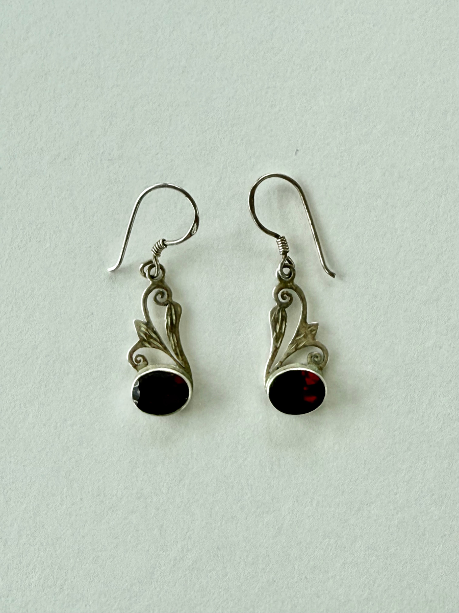 A different and fun look, a pair of oval, faceted garnets set in a swirl of sterling silver. 1.5 inch drop.