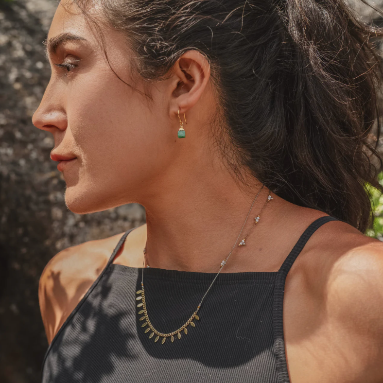Gemstone Nugget Earrings are everyday earrings in a brilliant array of semi-precious gemstones. These pair beautifully with our Trail necklaces or keep it simple and throw it on with a Pool Drop necklace in gold. Bronwen has been living in hers. 18k gold plated ear wire is warming and beautiful on all skin tones.
