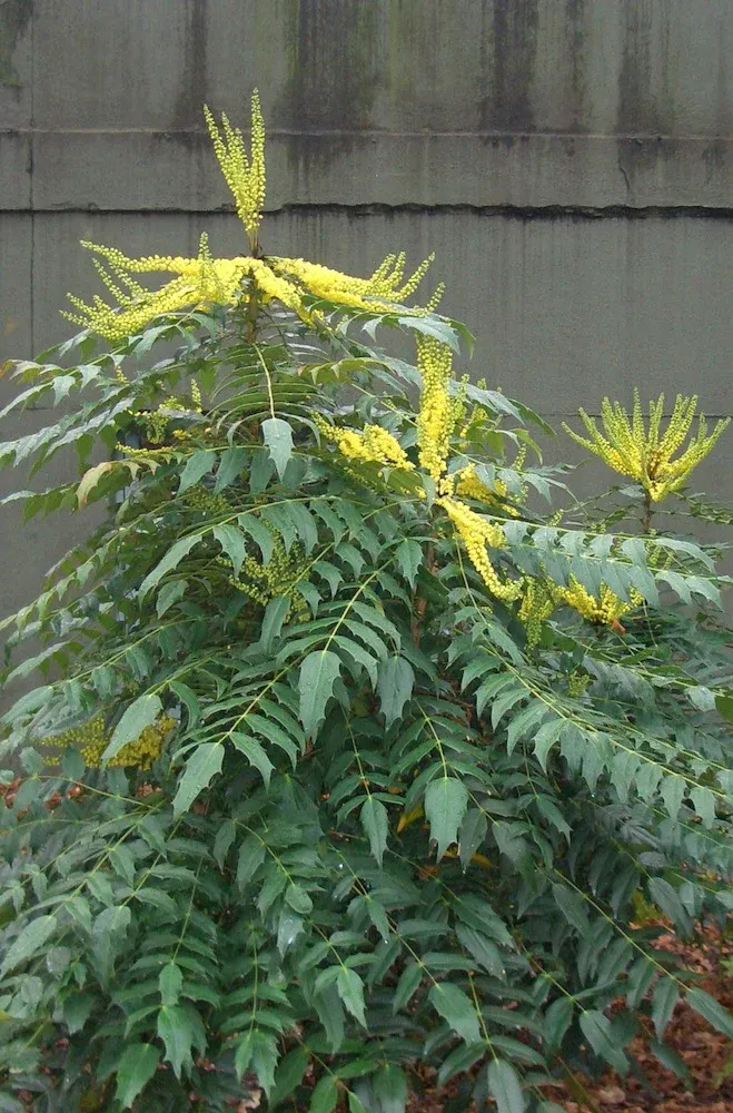 Any plant that offers cheer during the winter months is appreciated. When one thinks of winter interest, evergreens, berries, and bark generally come to mind. Flowers? Not usually, unless you are familiar with Mahonia x media. Several cultivars, crosses between Mahonia lomariifolia and M. japonica, bloom during December. This evergreen shrub typically reaches 8 to 15 feet in height. Dark green leathery leaves, found on the top half of the plant, are composed of an odd number of individual leaflets. Flowers range in color from lemon to bright yellow and are held in rigid racemes at the end of branches. Bright blue fruit follows. (description per Scott Arboretum and Gardens)