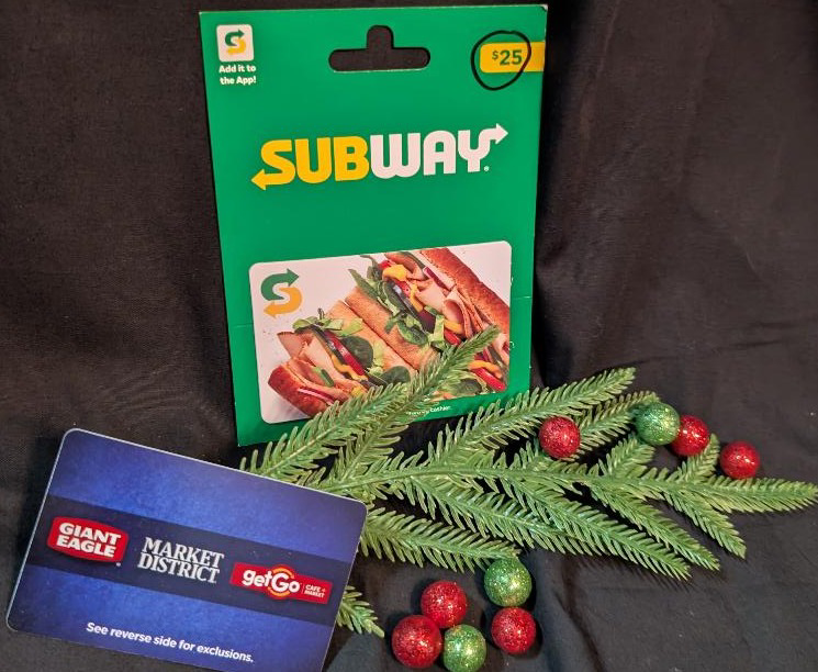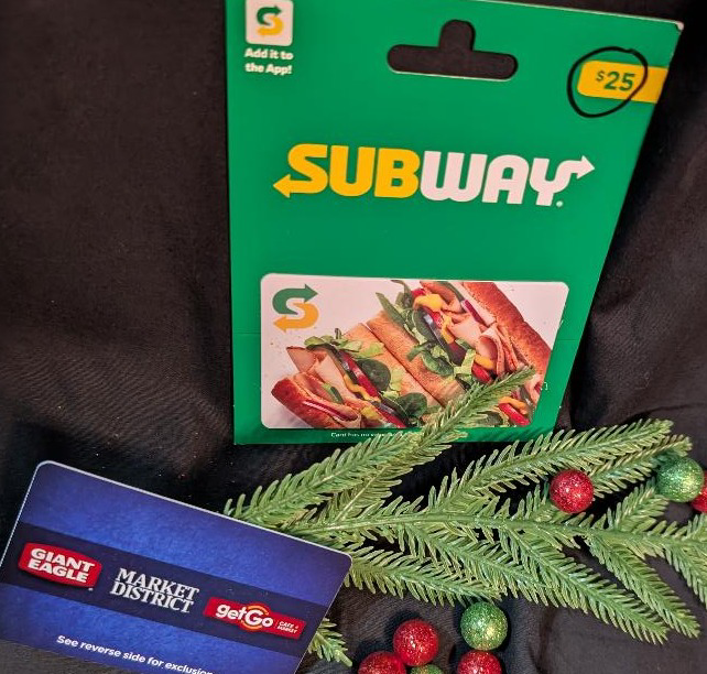 Includes a $25 gift card to Giant Eagle and a $25 gift card to Subways......... great stocking stuffers! Happy Holidays!
