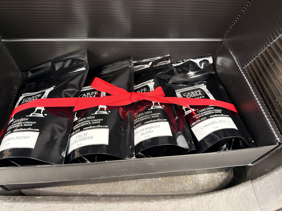 Gift Box of Coffee from Carpe Diem including 8 oz each of carpe diem blend, decaf columbian, thunderbolt blend and caramel nut.