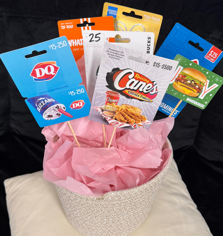 Treat yourself (or someone special!) with our amazing Gift Basket Raffle! This bundle is packed with goodies, including gift cards to Dairy Queen, Raising Cane’s, Starbucks, Whataburger (yes, TWO!), Domino’s, and even a Visa gift card 💳🎉