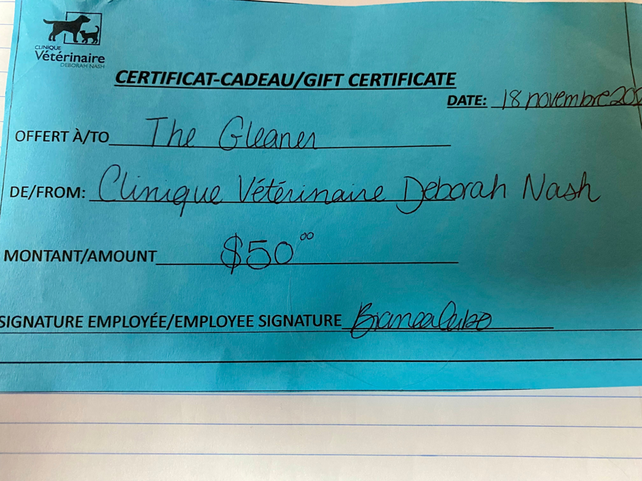 Gift certificate from Clinique Vétérinaire Deborah Nash / Certificat cadeau de la Clinique Vétérinaire Deborah Nash