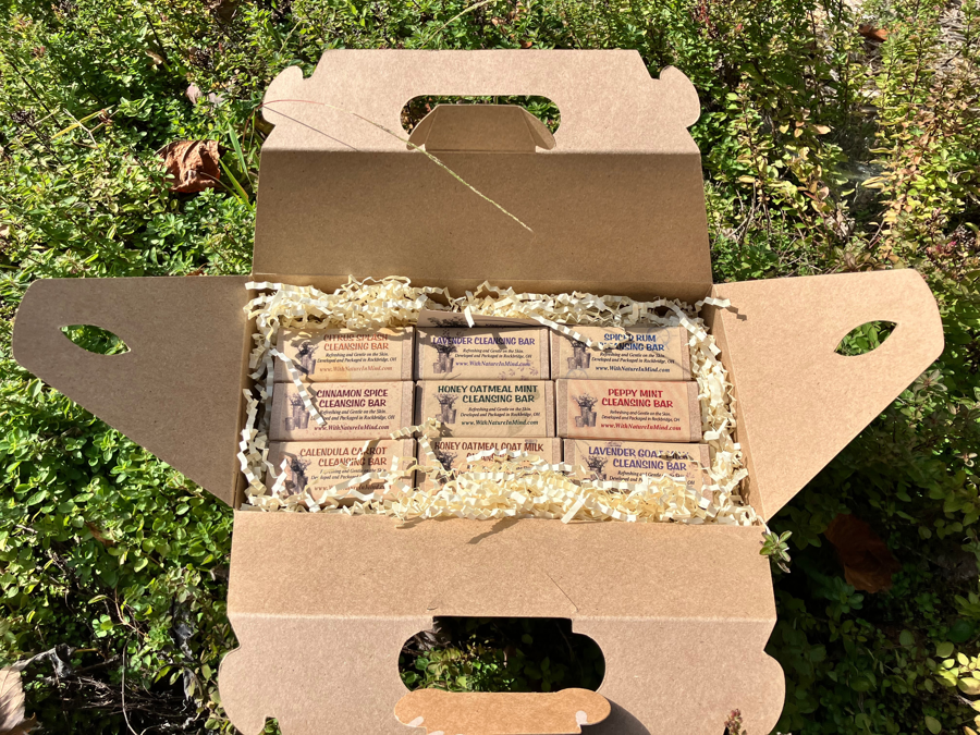 You will enjoy 9 bars of soothing, oil-based handmade soap. The assortment includes Calendula Carrot Oil Soap, Cinnamon Spice Soap, Citrus Splash Soap, Honey Oatmeal Goat Milk Soap, Honey Oatmeal Mint Soap, Lavender Soap, Lavender Goat Milk Soap, Peppy Mint Soap and Spiced Rum Soap.