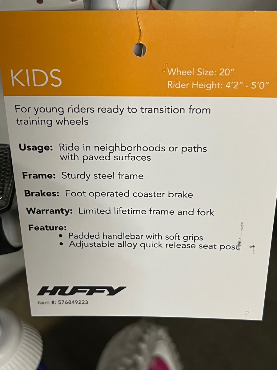 Kid’s 20” bike for rider height 4’2”-5”. Steel frame