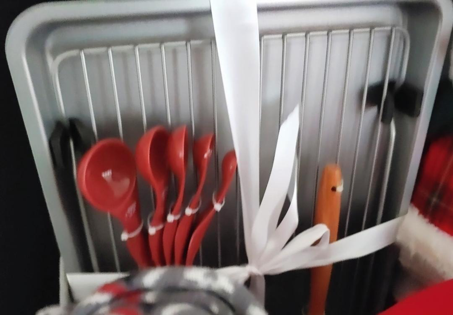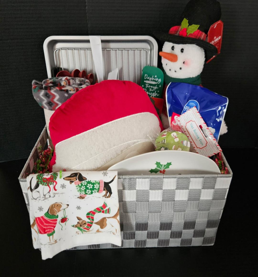 The perfect basket for that baker in your life. Includes "The Giving Plate", cake mix, icing, cake decorating toppings, cookie cutters, holiday spatula, cake pan, measuring spoons, holiday dog themed kitchen towel, cup cake cups, fleece blanket, and an adorable Snowman!