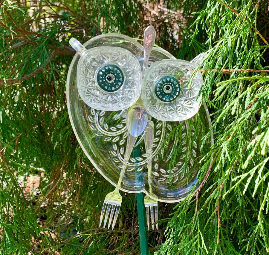 Add some whimsey to your garden with this glass garden art that has been newly created using repurposed glassware. Forks serve as its legs and feet. Included is a mounting pole. It has been assembled using industrial-strength indoor/outdoor adhesive to withstand the weather.