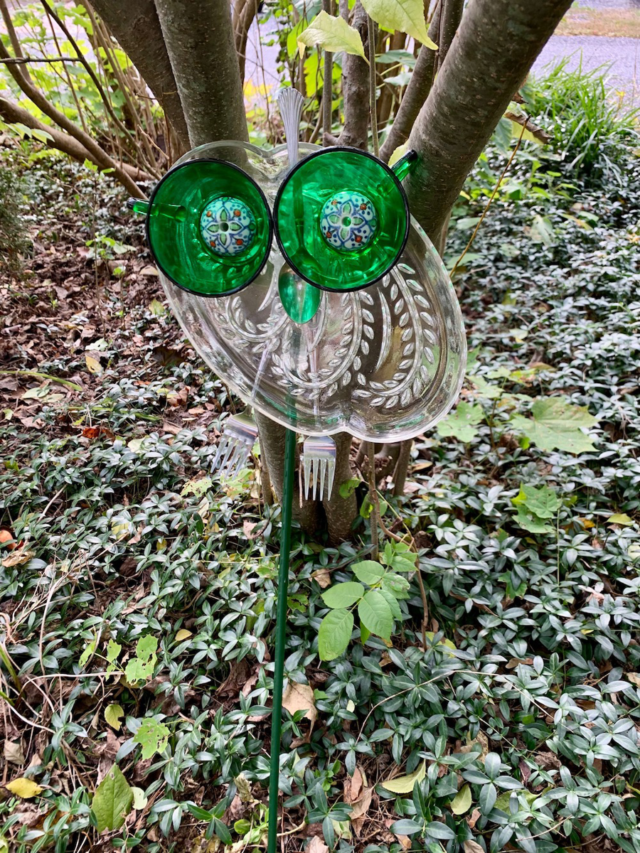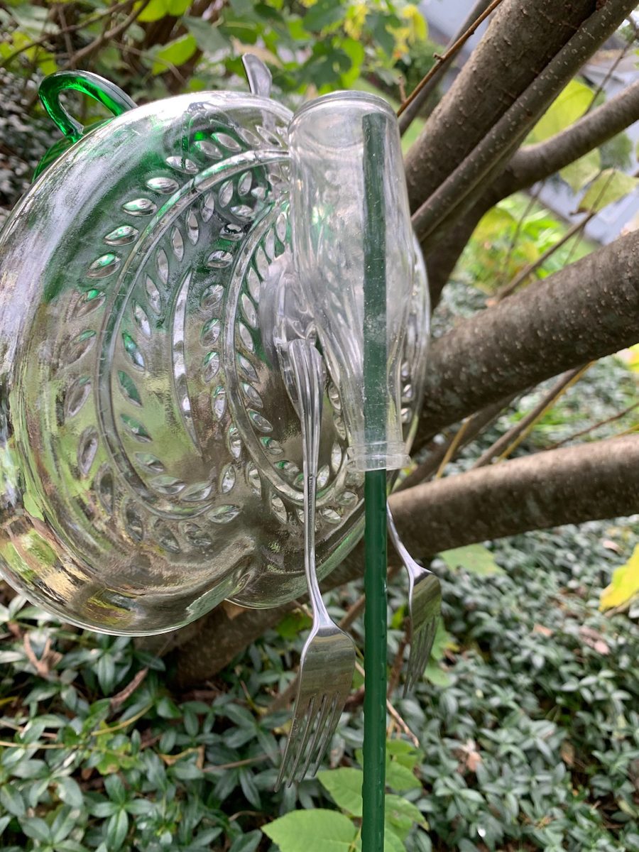 Add some whimsey to your garden with this glass garden art that has been newly created using repurposed glassware. Forks serve as its legs and feet. Included is a mounting pole. It has been assembled using industrial-strength indoor/outdoor adhesive to withstand the weather.
