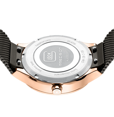GLOCK Precision Ladie's Watch - Model GW-28-2-18. This watch radiates classic elegance. Its shiny, rose gold-tone stainless steel case and gunmetal mesh band surround a reliable Swiss movement. The color-coordinated dial, accented by twelve genuine diamonds as well as hands featuring Swiss Super-LumiNova®, introduces an additional level of luxury. With 10 ATM water resistance, it unites premium functionality with timeless design.