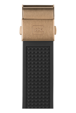 GLOCK Precision Men's Watch - Model GW-34-1-24. The coyote-tone stainless steel case complements a modern, black silicone strap with GLOCK's RTF texture. The black dial, featuring the distinctive bullet casing detail, displays hands and indices with Swiss Super-LumiNova® for improved readability even in challenging lighting conditions. Driven by a reliable Swiss movement, equipped with a chronograph function, and featuring a 20 ATM water-resistance rating, this watch presents both functionality and style.