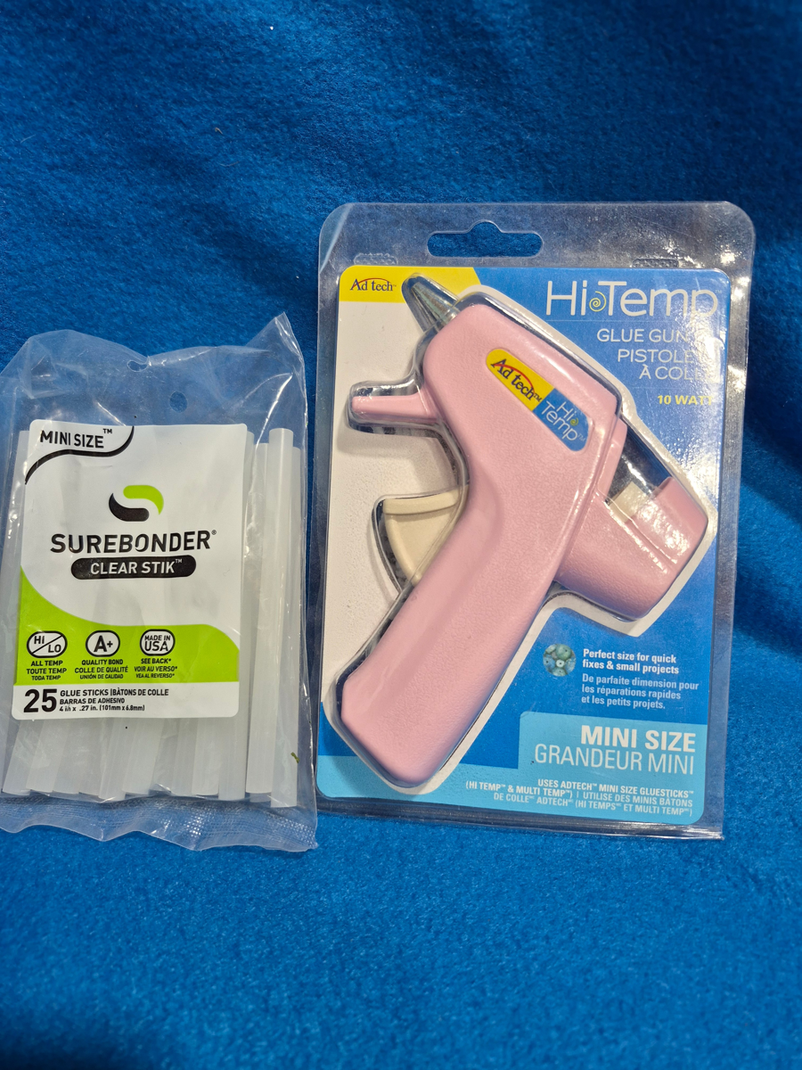 Hi temp, mini size glue gun and package of 25 glue sticks.
