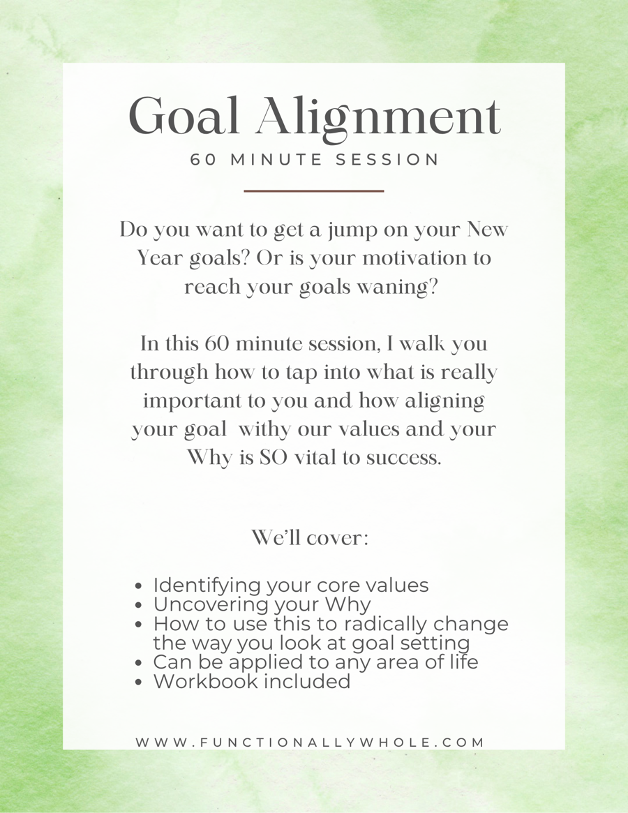 Do you want to set yourself up for success when setting your goals? Or do you have a goal, but your motivation to reach it is waning? Often when we set goals, we set them based on what we THINK we should be doing, without taking into consideration if that goal is actually what we truly want. In this 60 minute session, Virginia of Functionally Whole Health & Wellness Coaching will walk you through how to tap into what is really important to you and how aligning your goal to this is SO vital to success. This session covers: - Identifying your core values - Uncovering your Why - How to use this to change the way you look at goal setting - How this can be applied to any area of your life - Workbook included Website for this session: https://www.functionallywhole.com/programs/goal-alignment-session