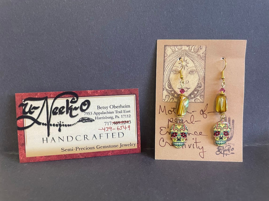 U~Neek~O Handcrafted Semi-Precious Gemstone Jewelry Oblong Mother of Pearl stones with gold tinted skull charms. Gold colored accents. Enhances creativity. Almost 2” in length. Donated by: Betsy Oberheim