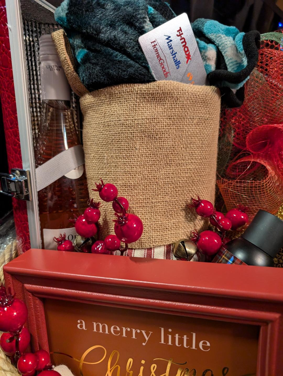 What a fun basket! This reusable basket comes with a $15 gift card to TJ Max, Marshalls, or HomeGoods, A warm blanket, Two Holiday Stockings, Christmas Sign, A Golden Terrier Statue 9.5 x 11.5 x 4.5, Holiday Room Spray, and a bottle of Jean Chatelier Oppoul Rosé wine (Cat Label)that comes in a very fancy red carrying case. Decorated very festive and ready for gift giving or enjoy for yourself. Happy Holidays!