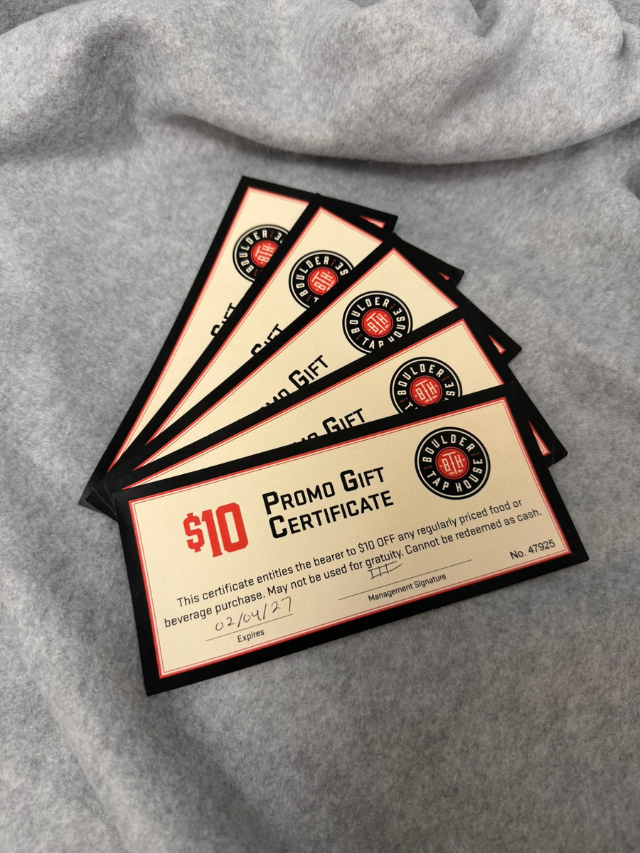 This package includes 5 individual $10 gift certificates to Boulder Tap House — ideal for multiple visits or sharing with friends. A great choice for anyone who loves relaxed dining and bold flavors.