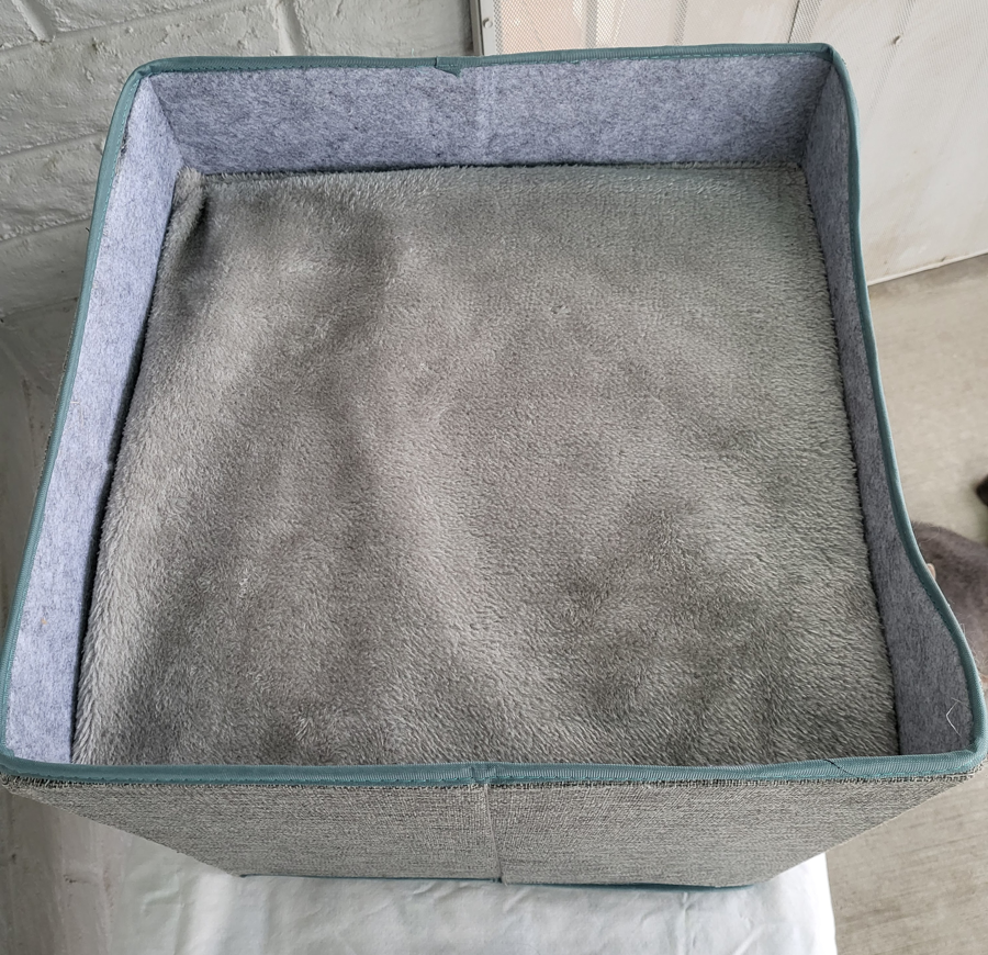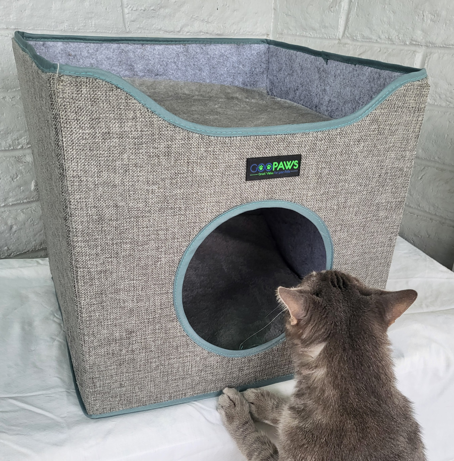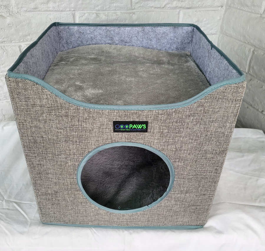 This sturdy cat hideaway features an interior padded space as well as a pad on top that your kitty can lounge on. Conveniently folds flat for travel or storage. Measures about 15" x 15" x 15", in new condition.